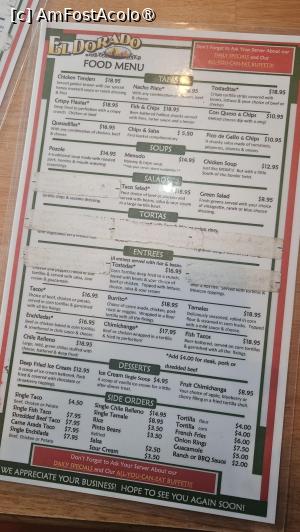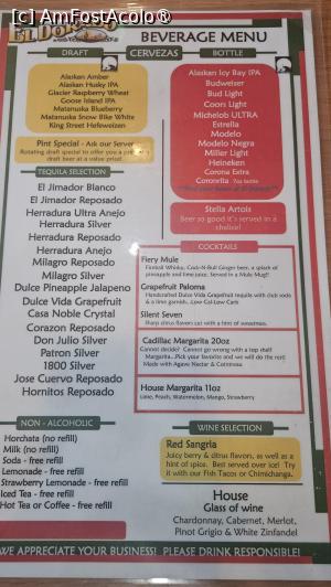 Înăuntru era răcoare. Lemn vechi, lumină caldă, voci joase. Nimic spectaculos, dar totul autentic. Ne-așezat la masa, iar chelnerul foarte binevoitor ne-a adus rapid meniul. Toți aici în Alaska au fost extrem de amabili și cel de la El Dorado nu făcea excepție. Atmosfera din local era foarte faină, iar muzica surprinzător nu era mexicană, ci autentică din state. Nu prea se potrivea cu localul, dar era muzică de calitate care crea o atmosferă foarte plăcută.