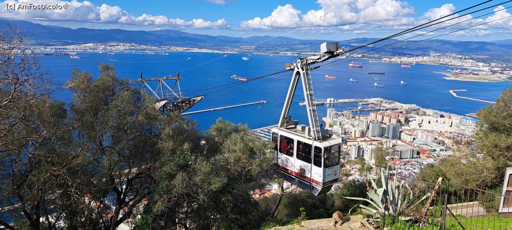 Am lăsat mașina într-o uriașă parcare, contra cost, în orașul de graniță La Línea de la Concepción, (calculul la final 14,80 €), apoi am trecut frontiera per pedes. Cumpăraserăm dinainte, online, bilete (41,5 Ł/pers.) pentru Rezervație (Gibraltar Nature Reserve) ce includeau toate punctele de interes din interiorul său și doar urcușul cu telecabina pe stâncă, gândind să începem cu vârful de unde să conturăm un traseu care să cuprindă mai multe obiective care ne făceau cu ochiul și apoi să coborâm la pas. Așa ne-am amuzat cu macacii jucăuși, ne-am maimuțărit împreună cu ei un pic, pe urmă ne-am pozat pe platforma Skywalk, am vizitat bateria O’Hara, peștera Saint Michael, Coloanele lui Hercule.