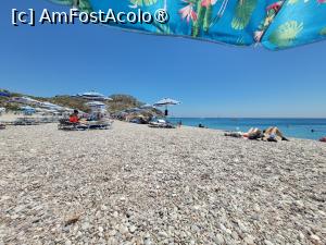 Faliraki este plaja stațiunii în care ne-am cazat. Chiar dacă are o lungime de peste 4 km, nisip și pietriș în mare parte și toate facilitățile, am preferat să nu rămânem mai mult de o jumătate de zi aici. Plajă este foarte aglomerată și deci și foarte gălăgioasă. Este exact plaja unei stațiuni! Cu miros de pește prăjit, copii care îți aruncă nisipul pe prosop, muzică și voie bună a vecinilor de șezlong. Însă este plaja preferată de către toți turiștii familiști. Tot aici se găsește și un vestit parc acvatic. Există zone anenajate cu sejlonguri și umbrele dar și zone libere, pentru cearceaf.