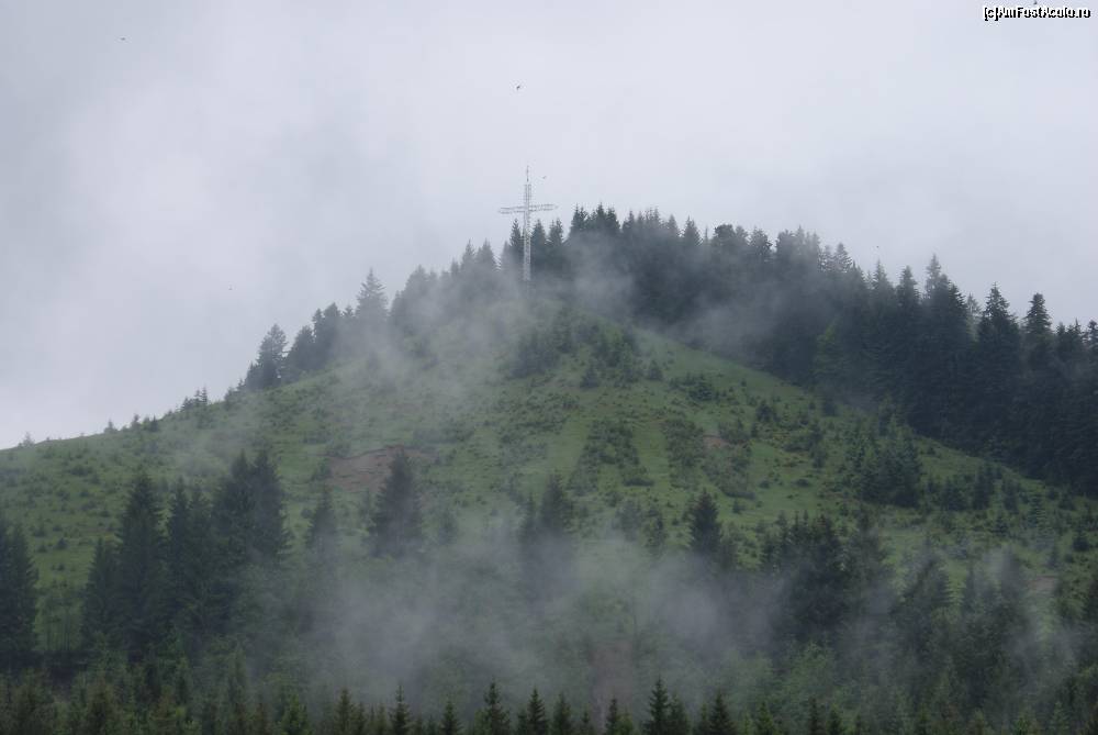 [P22] Pe dealul de la sudul mănăstirii Putna, printre nori se zăreşte crucea din vârf. Mai jos, pe panta dezgolită, se poate citi cuvântul ŞTEFAN, scris cu brăduţi