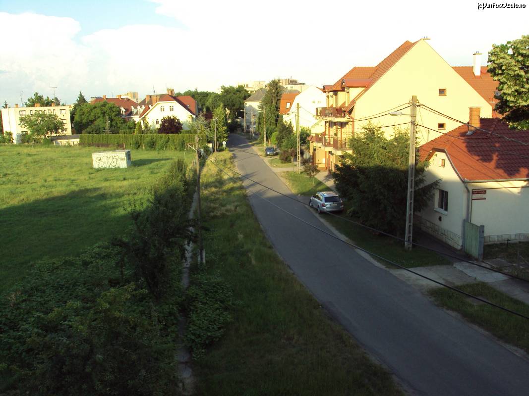 [P10] Fotografie din balcon, cu strada, terenul viran şi vilele de vizavi din partea stângă.