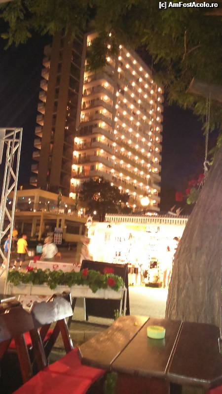 [P01] Hotelul vazut seara de pe terasa de unde se poate manca fish and chips. Timp de o ora seara (23-24) se aprid automat toate becurile din balcoanele hotelurilor. Parca esti in Las Vegas!