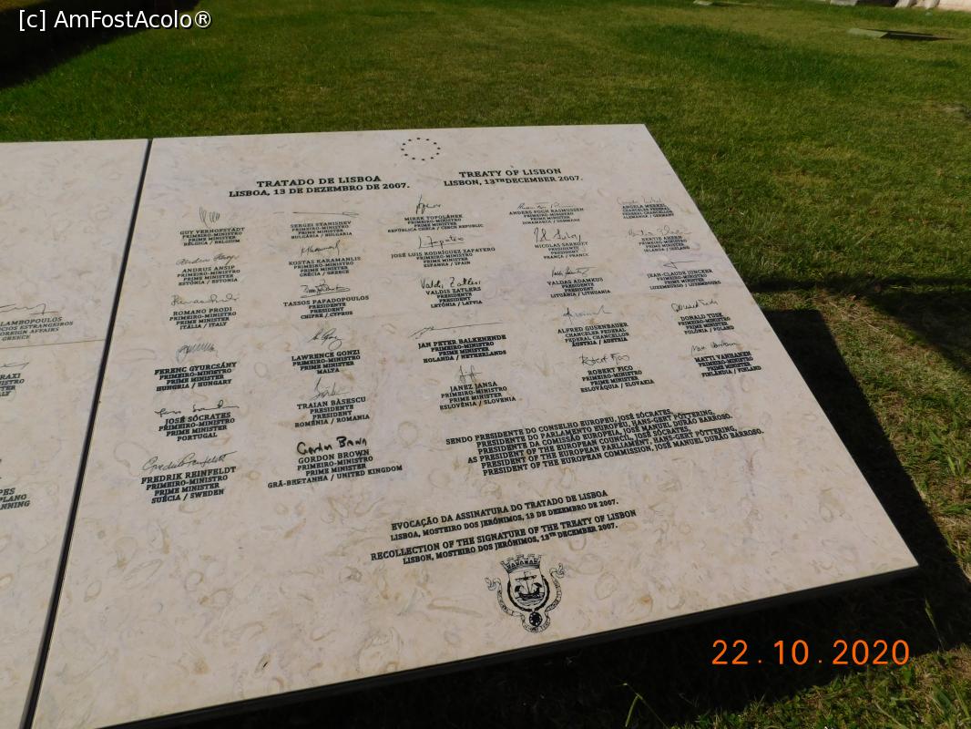 [P56] O placă din faţa Mosteiro dos Jerónimos aminteşte că tratatul de la Lisabona, din 13 decembrie 2007 pentru reforma Comunităţii Uniunii Europene s-a încheiat la Mosteiro dos Jerónimos. Se observă că din partea României a semnat fostul preşedinte, Traian Băsescu