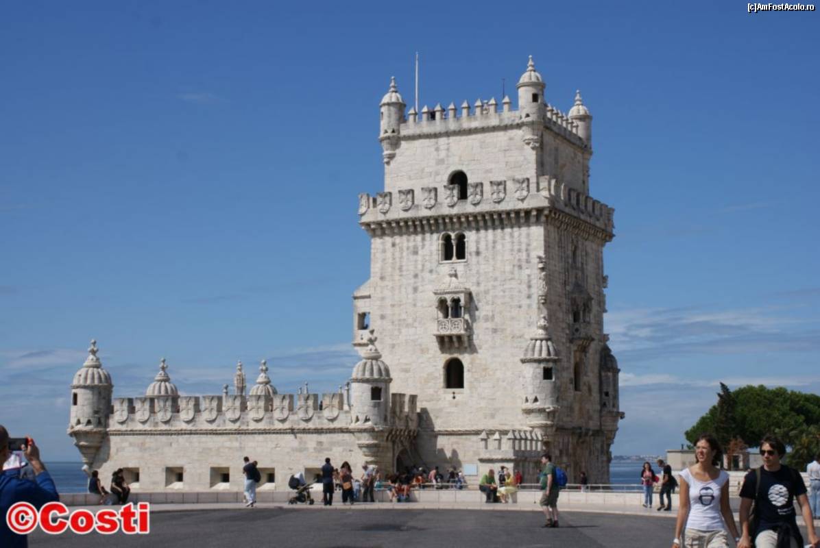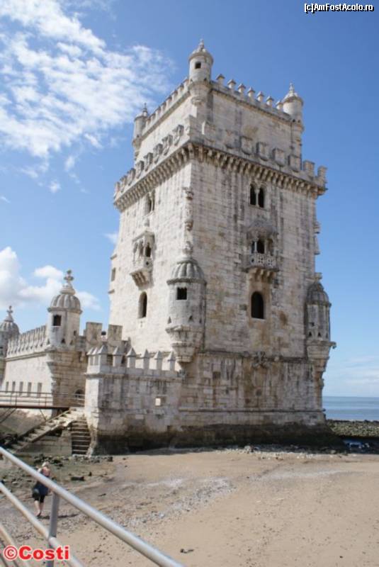 [P05] Torre de Belém, cu secțiune pătrată, înalt de 30 m, se afla inițial pe o insuliță. Între timp, uscatul s-a întins, dar încă, în timpul fluxului, turnul este înconjurat de ape.