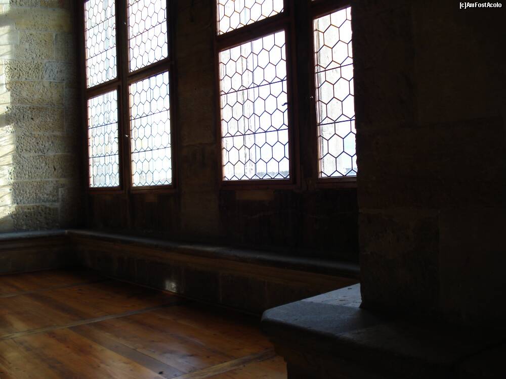 [P16] Praga - Castelul - Sala Vladislav din Vechiul Palat Regal, ferestrele si o lunga banca din piatra