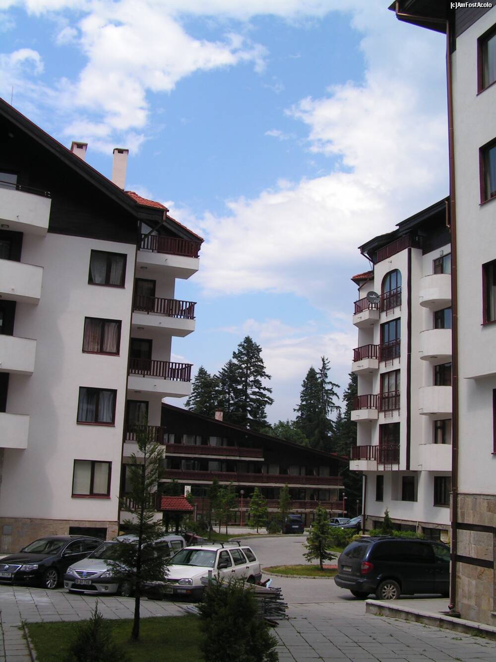 [P14] vedere din balcon, un colt din cel de al 4-lea bloc, parcarea"mare" si unul dintre hoteluri. Peste strada se ajunge direct la baza partiei, unde sunt si utilajele de transport pe cablu.