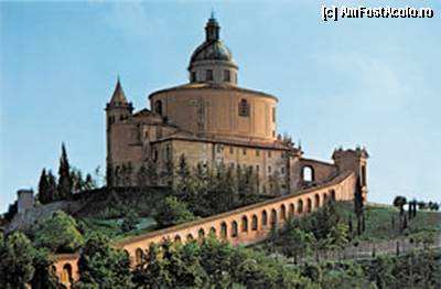 [P11] Biserica Madonna di San Luca, aflată pe o colină din apropierea orașului, este legată de Bologna prin Arco del Meloncello, un drum de 3,5 km acoperit de arcade. Foto este scanare de pe o vedere.