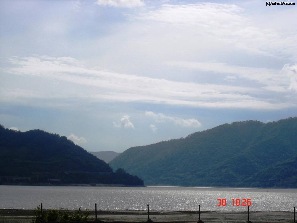 [P05] Golful Dubova - perspectivă spre Cazanele Mari. În prim plan aluviuni masive depuse la mal şi care ies la suprafaţă la cote mai mici ale apei în lac.