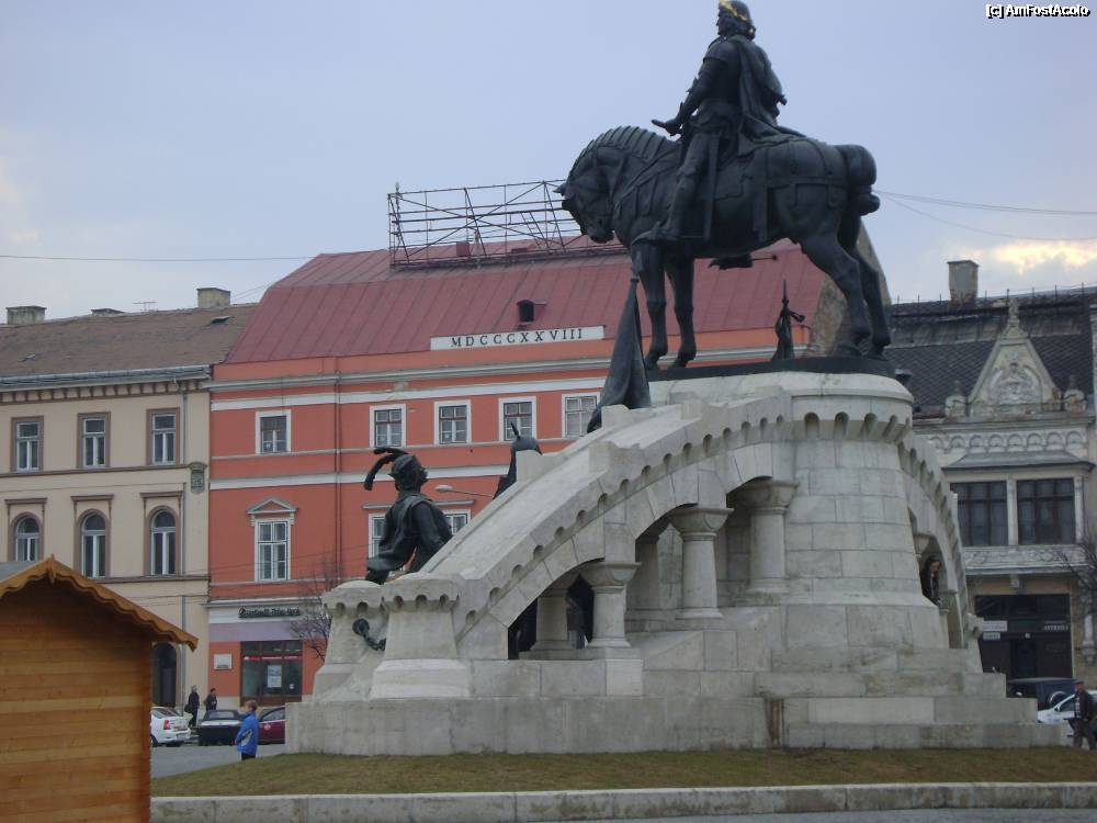 [P14] Cluj - Napoca - Statuia lui matei Corvin, iar in fundal, cladirea rosie este Palatul Jasika, iar cea din dreapta, Casa Was Otilia