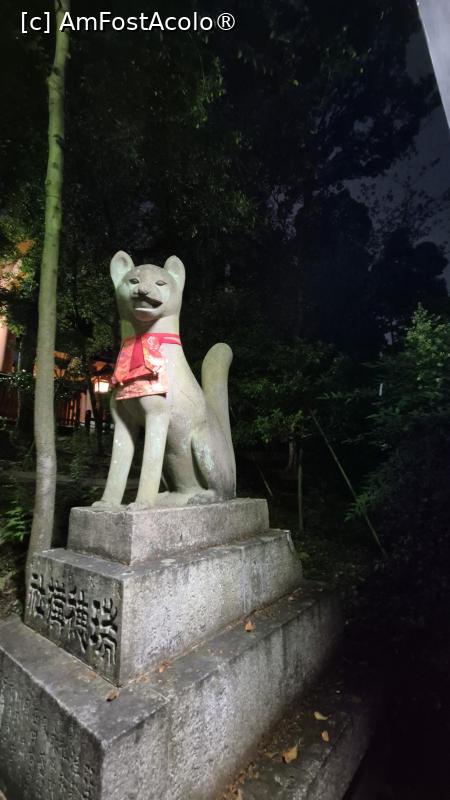 [P06] Poarta este flancata de alte 2 statui reprezentand vulpi, una dintre ele avand o cheie in gura, fiind protectoarea granarelor de orez. Avand in vedere cat de important este orezul pentru istoria, cultura, economia si bucataria japoneza, nu este de mirare ca detinatorul cheilor de la granare este o creatura respectata si venerata si ca exista in Japonia aproximativ 30.000 de altare pentru celebrarea zeului Inari.