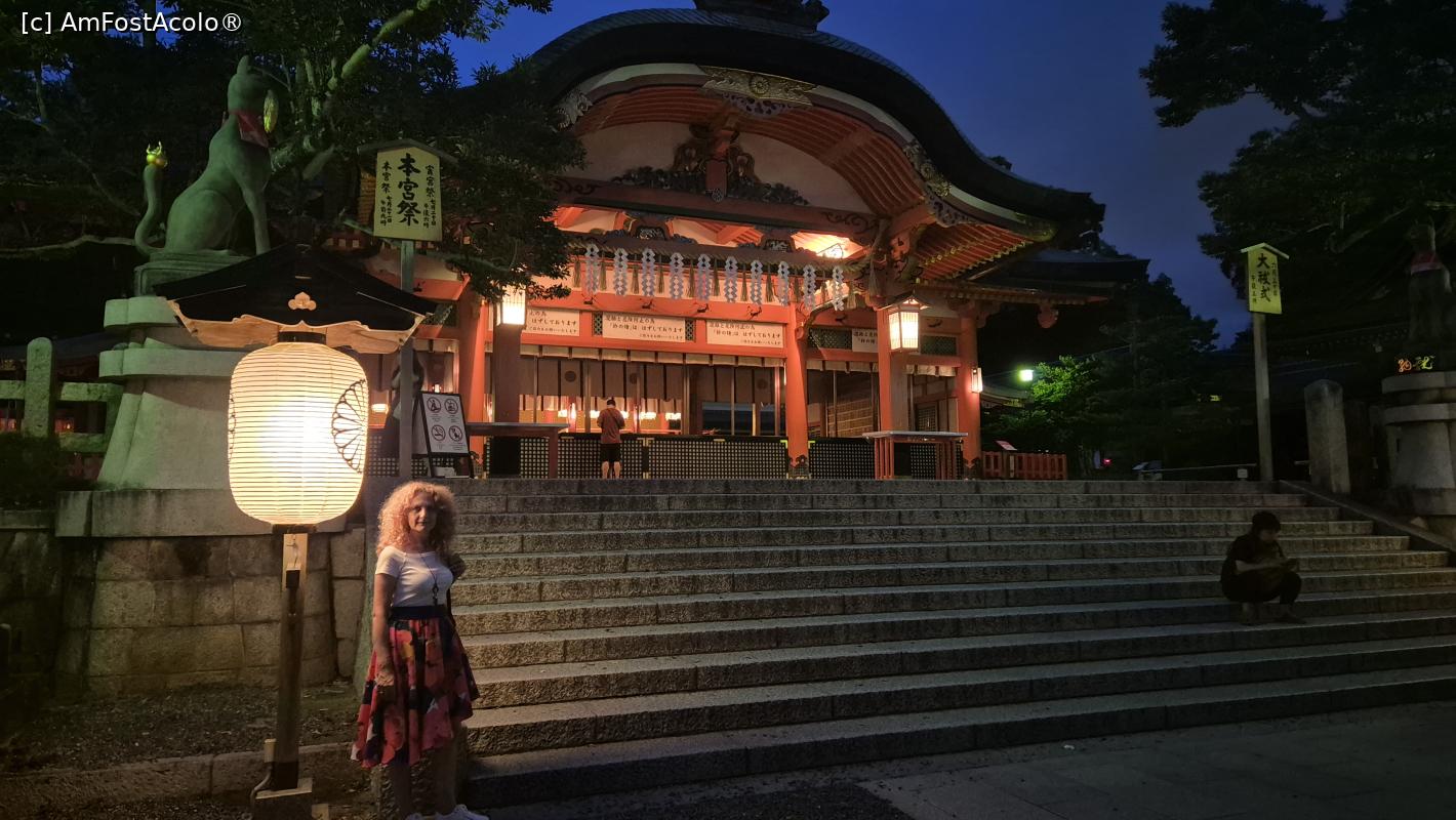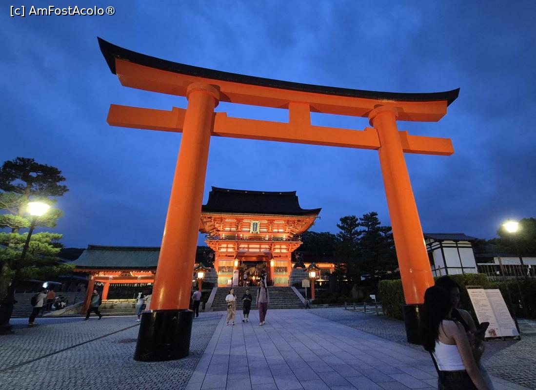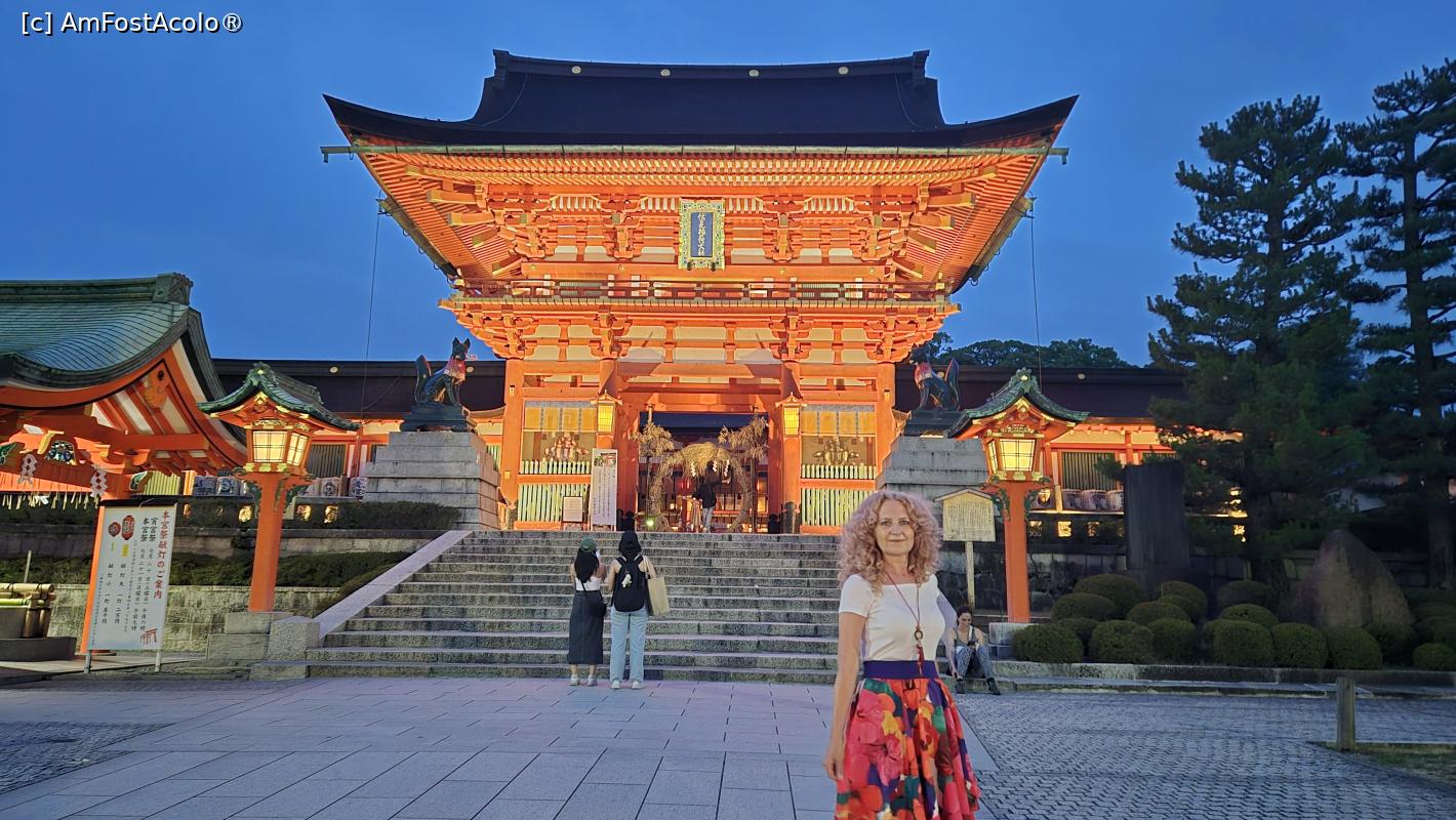 [P01] Fushimi Inari Taisha este dedicat lui Inari, zeul Shinto al recoltei de orez, al comertului si al afacerilor. Acest altar este renumit pentru miile de porti portocalii torii sub care o poteca serpuieste prin padure si pe terenurile sacre ale Muntelui Inari. Este alcatuit din cinci sanctuare principale, un altar inferior, mijlociu, superior si 2 altare auxiliare, plus multe altare secundare mai mici. In dreapta primei porti a altarului se afla statuia unei vulpi, mesagera zeului orezului.