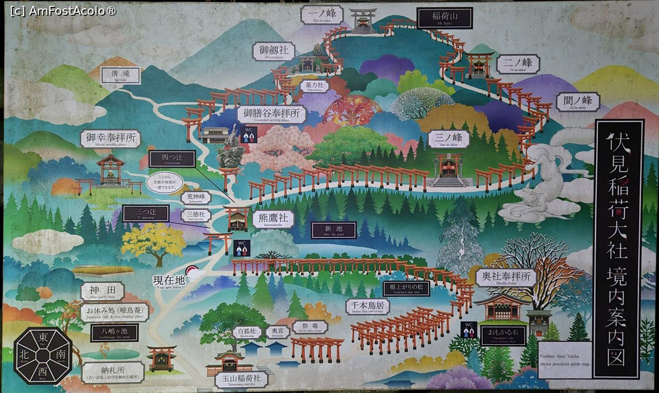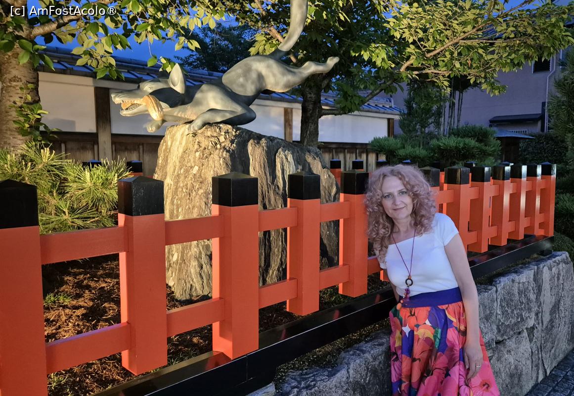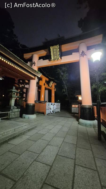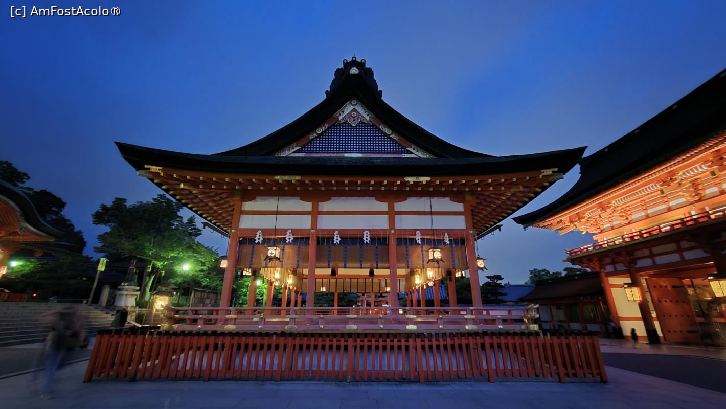 [P01] Fushimi Inari Taisha este dedicat lui Inari, zeul Shinto al recoltei de orez, al comertului si al afacerilor. Acest altar este renumit pentru miile de porti portocalii torii sub care o poteca serpuieste prin padure si pe terenurile sacre ale Muntelui Inari. Este alcatuit din cinci sanctuare principale, un altar inferior, mijlociu, superior si 2 altare auxiliare, plus multe altare secundare mai mici. In dreapta primei porti a altarului se afla statuia unei vulpi, mesagera zeului orezului.