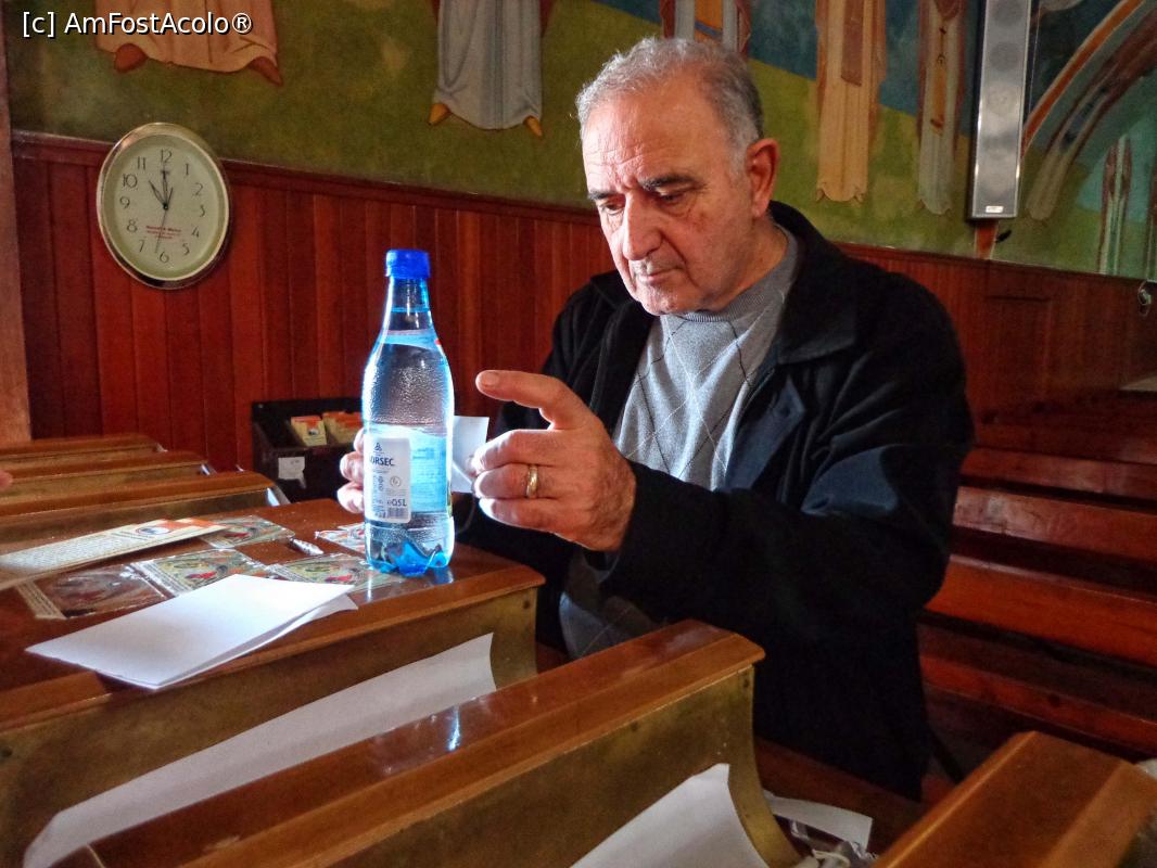 [P75] Nazaret, în naosul Bisericii ortodoxe Sfântul Arhanghel Gabriel: se aplică eticheta care atestă că apa este de la izvorul Maicii Domnului