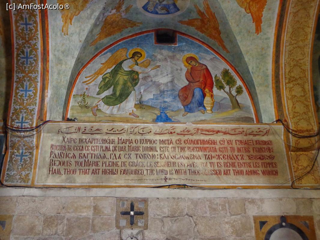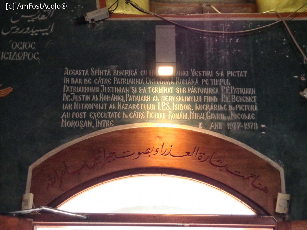 [P79] Nazaret, naosul Bisericii ortodoxe Sfântul Arhanghel Gabriel: pictură a fraților Moroșan cu caseta ce reproduce vestea Bunei Vestiri scrisă și în limba română