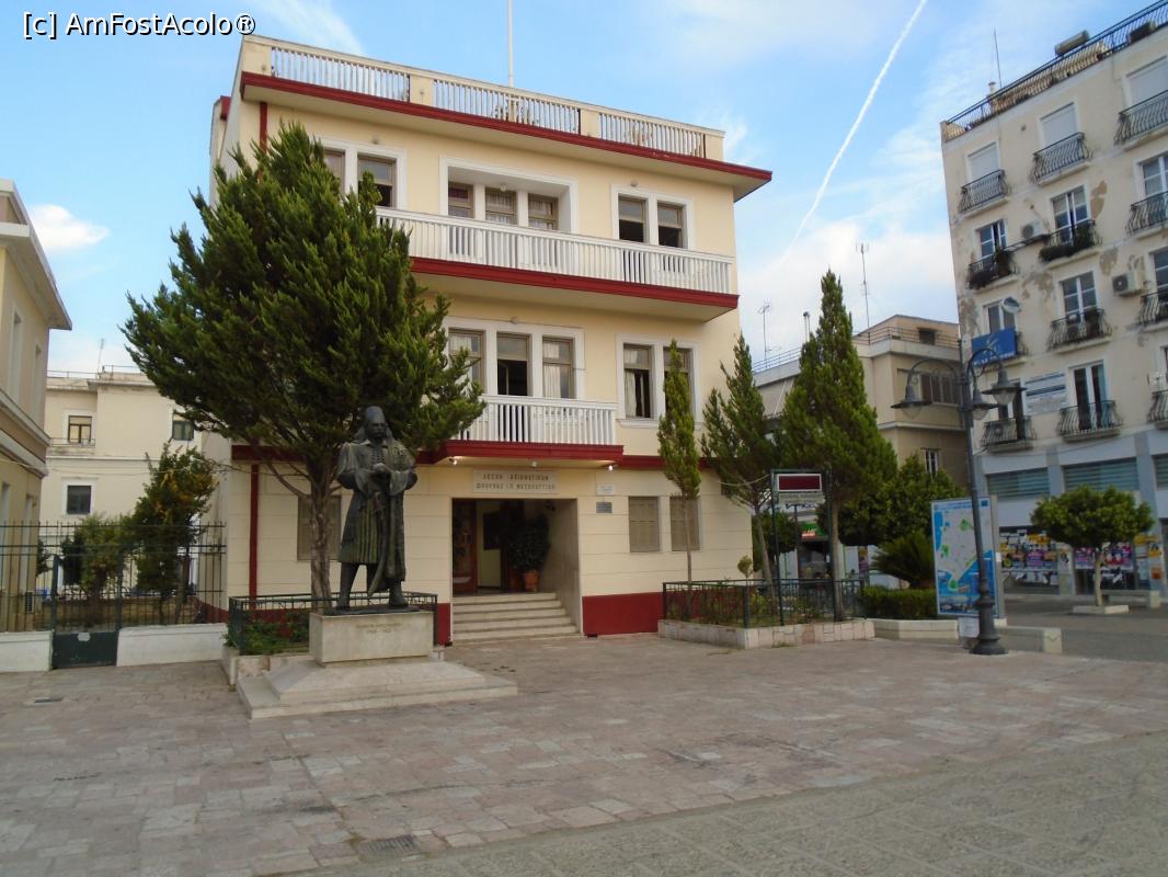 [P46] Piața Markou Botsaris: Muzeul de Istorie și Artă, flancat de statuile a doi prim-miniștri născuți în Missolonghi