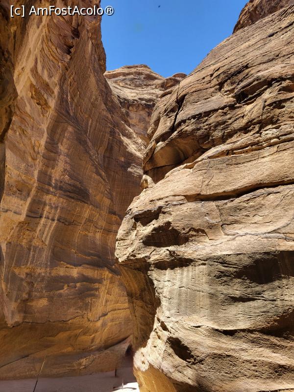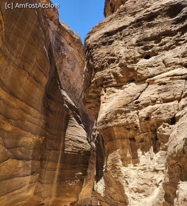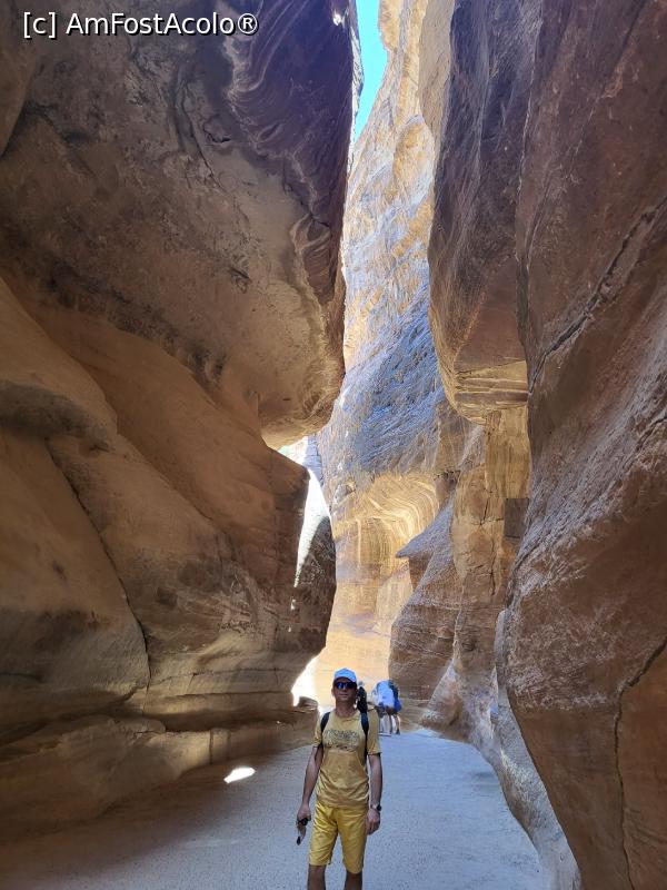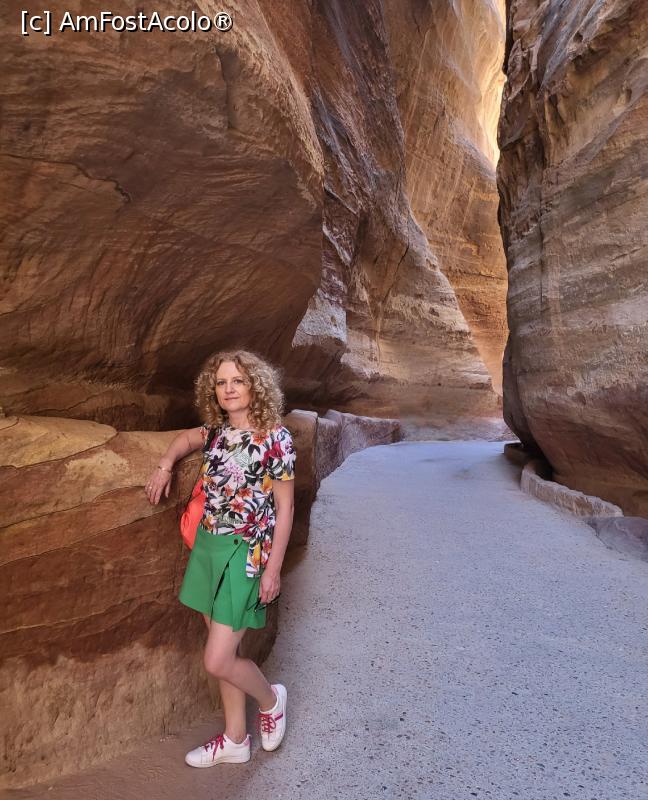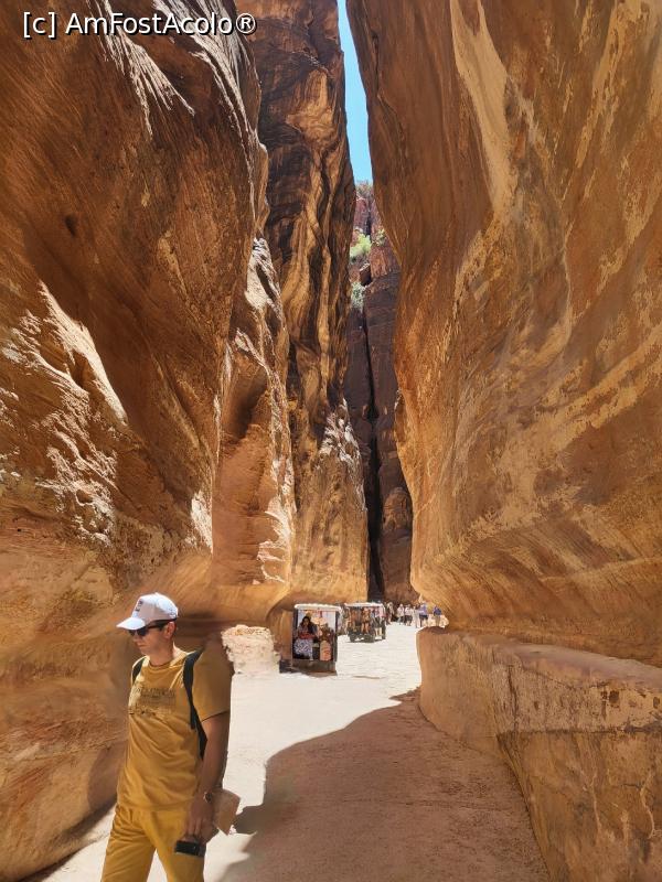 [P08] Traseul urmeaza cursul unui defileu foarte ingust si inalt, Siq, peretii apropiindu-se si lasand un loc de maxim 3 – 4 metri, intre ei, inaltimea acestora depasind 10 metri, cea mai mare parte a stancii fiind naturala, iar o parte, sculptata de nabateeni.