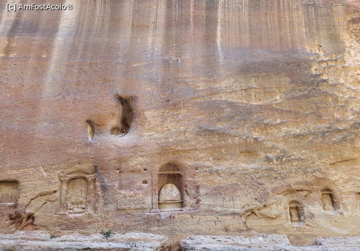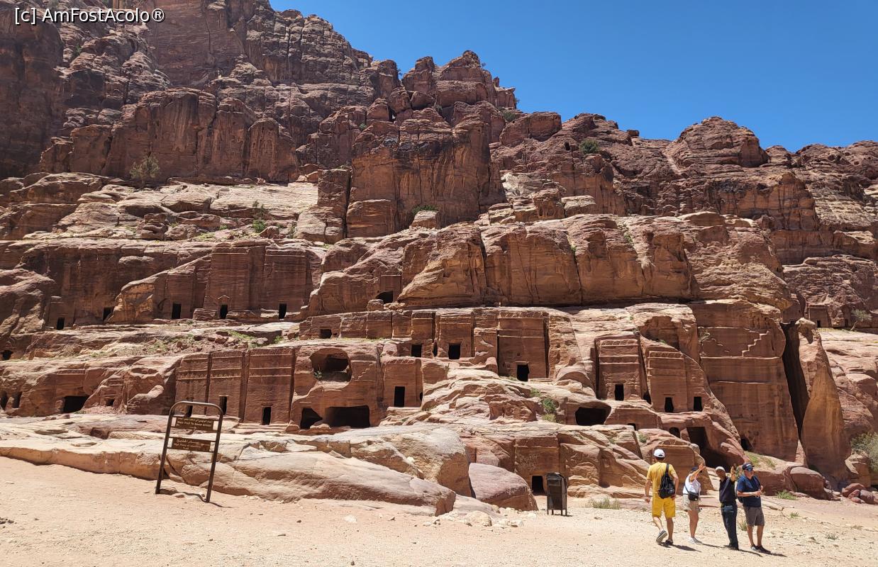 [P18] Ne-am continuat drumul pe Strada Fatadelor, nume dat sirului de morminte monumentale nabateene sculptate in stanca, canionul largindu-se treptat, ajungand intr-un spatiu deschis. Fatadele sunt incununate cu trepte, pilastri si cavitati.