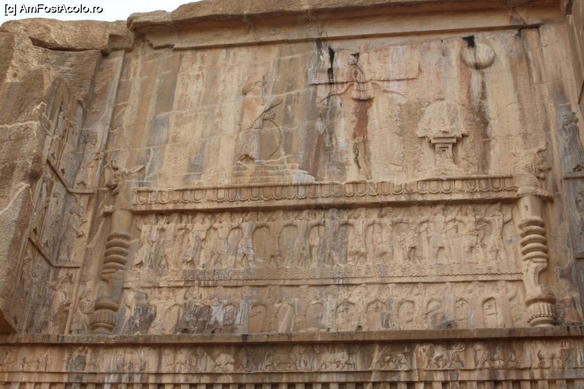 [P43] Persepolis, Mormântul lui Artaxerxes III, se văd Marele Rege, focul regal, luna și Faravahar, apoi dedesupt supușii ce țin tronul...