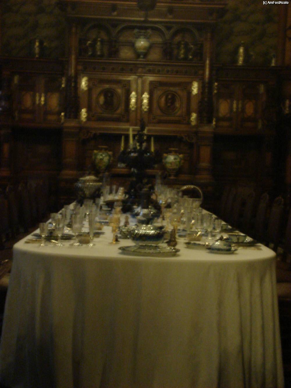 [P48] Castelul Peleş- sala de mese pentru oaspeţi, pregătită cu tacâmuri pentru 36 de persoane- îmi pare f. rău că este destul de mişcată fotografia