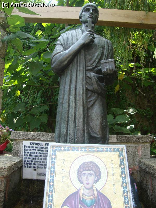 [P36] Plimbându-ne prin curtea mănăstirii am ajuns în dreptul Izvorului Vieții, de fapt o fântână zidită unde izvorul care murmură neîncetat este vegheat de către statuia Sfântului Pantelimon. Această sculptură în bronz este opera artistului Ion Jalea.