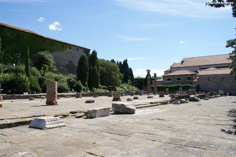 [P17] Ruinele Forului Roman. În spate, în dreapta, Basilica Cattedrale di San Giusto şi în stânga, Castelo di San Giusto