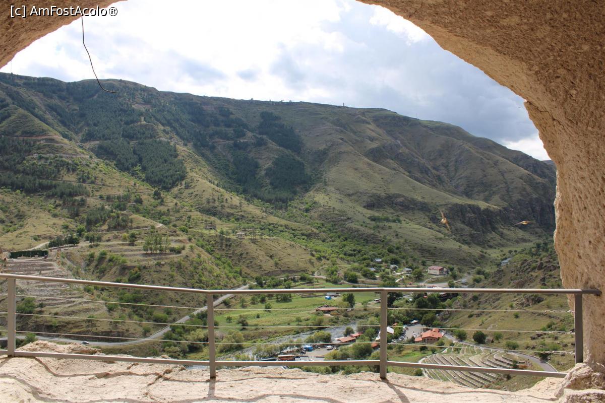 [P56] Vardzia, traforaj în piatră, Frumos se vede Orașul din Partea de Est de pe versantul muntelui Erusheti, suntem pe platforma din fața camerei lui Tamar