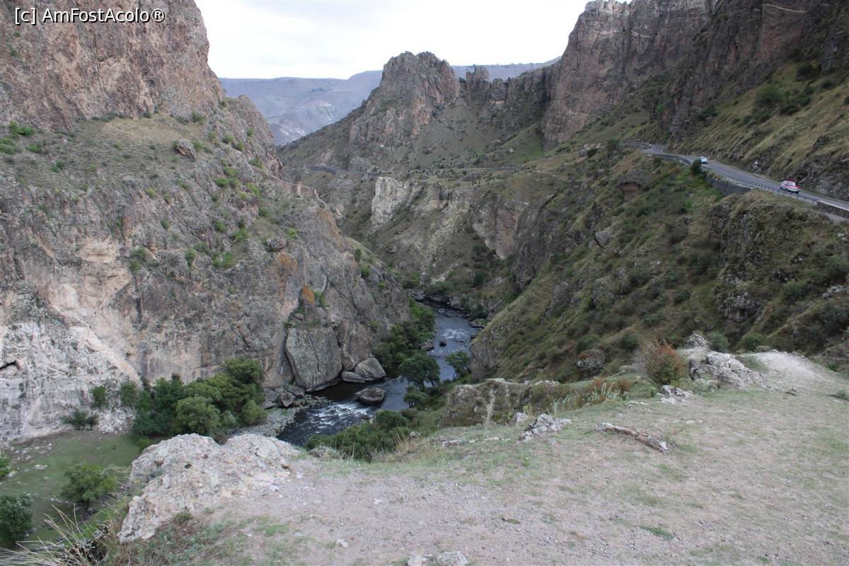 [P60] Vardzia, Vedere din Camera lui Tamar acum, în urmă cu sute de ani era acoperită, râul Kura și Parcarea