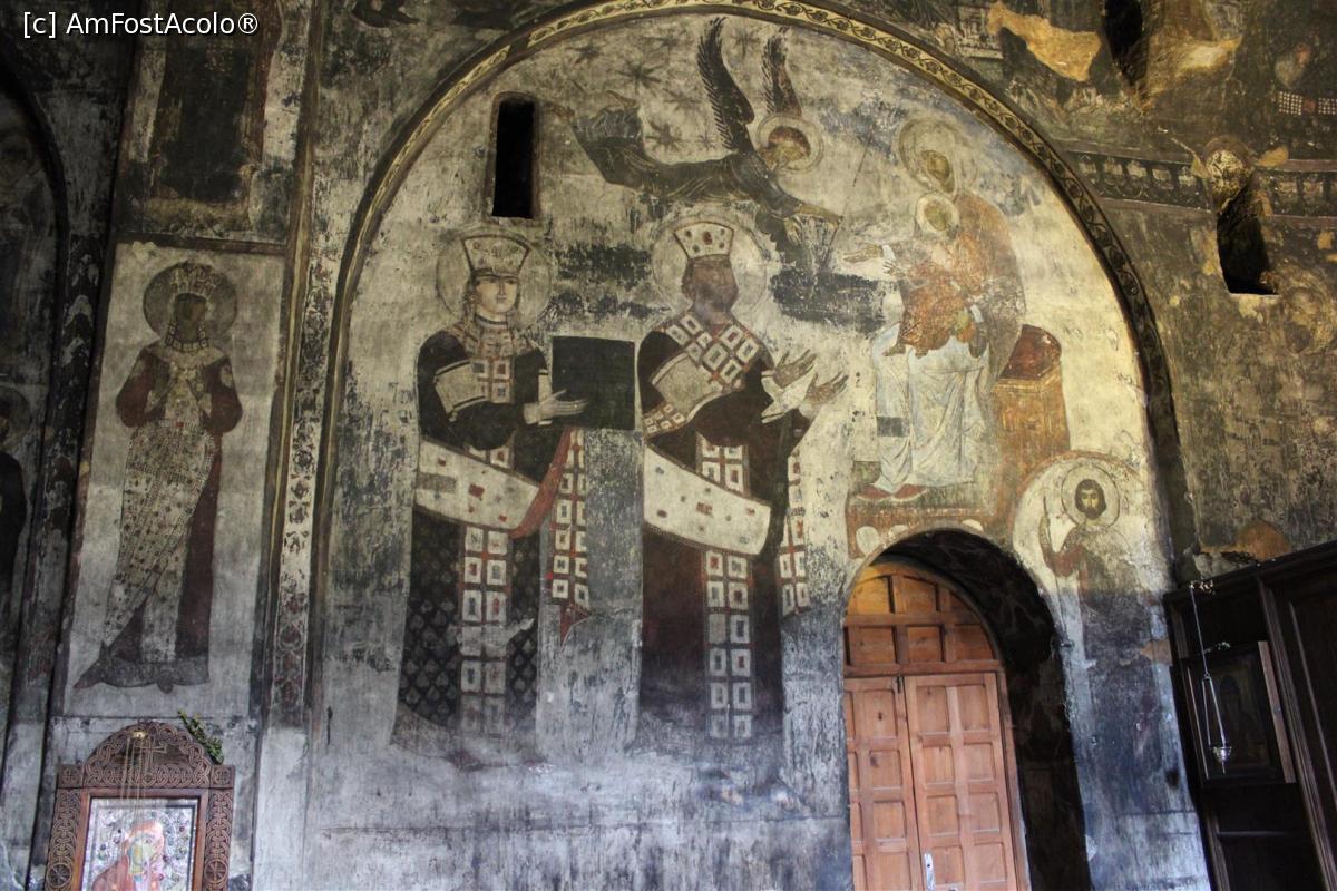 [P45] Vardzia, Biserica Adormirea Maicii Domnului, tablou cu Regina Tamar necăsătorită, nu are eșarfa femeilor căsătorite, și cu Regele George al III-lea, pe zidul de nord (pictură curățată), pictură document...