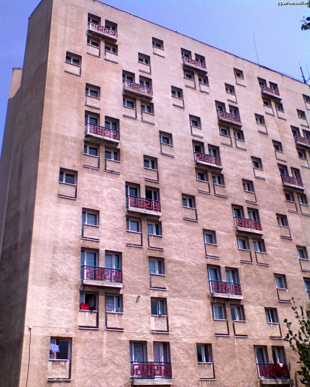 Fatada nordica a Hotelului Egreta din Venus. Asimetria ferestrelor inguste reprezinta elementul arhitectonic cel mai impresionant al acestei cladiri.