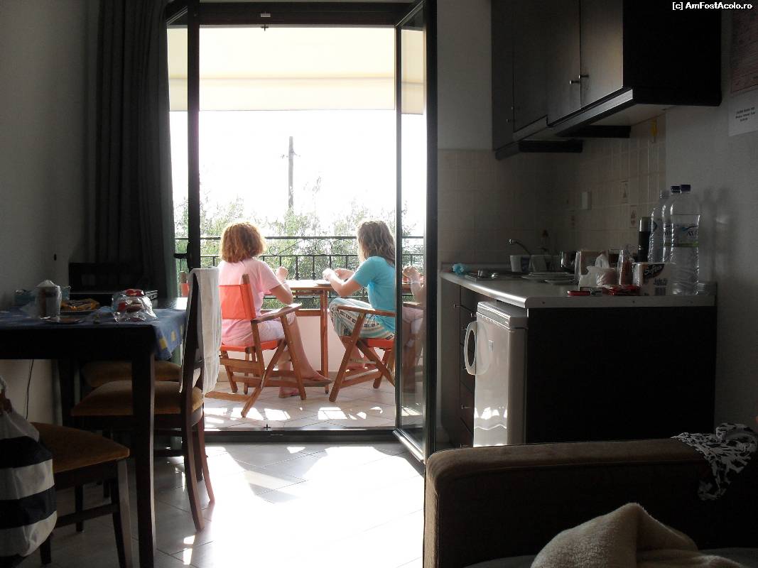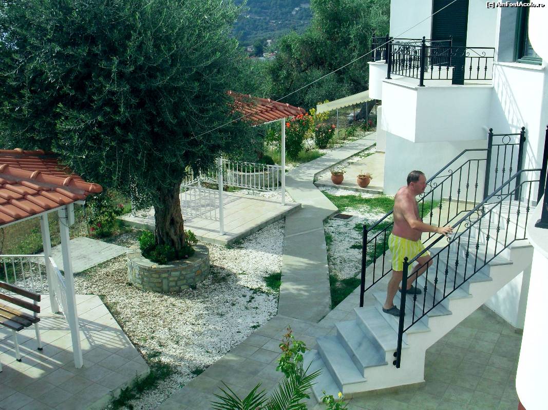 [P10] Curtea resortului de apartamente/camere Golden Beach Inn din Chrisi Ammoudia, Skala Panaghia, cu soarele si marea in fata.