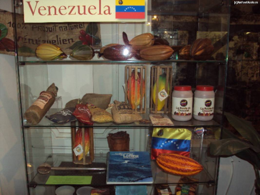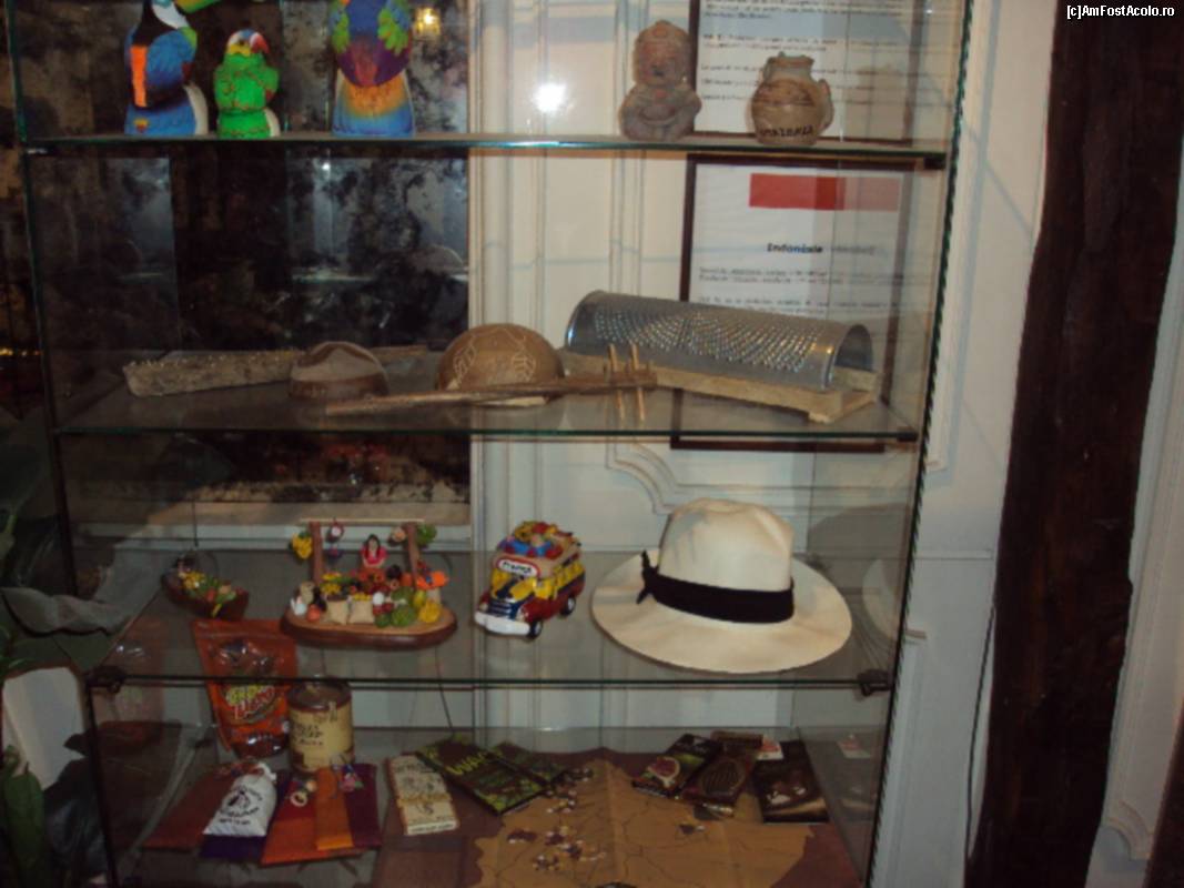 [P19] Musee du Chocolat: vitrină cu artefacte dintr-una din ţările cultivatoarea de cacao.