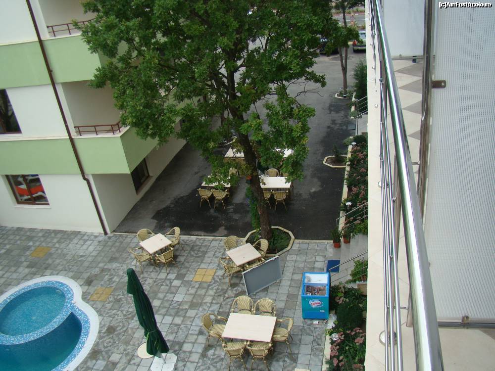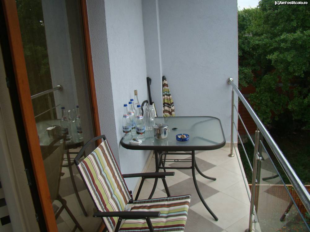 [P05] Balconul dupa sprit. Prosoapele se intind pe balustrada sau scaune. Frapiera, sticlele si paharele sint "prin amabilitatea" barului din lobby. Jos e piscina. Pe cealalta parte, vederea e catre un teren liber. Dupa copaci e calea ferata (nezgomotoasa).