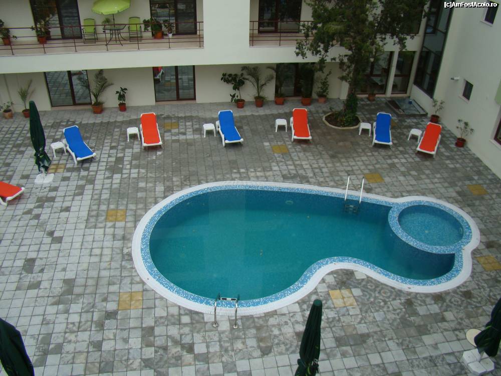 [P06] Asta e piscina, vazuta din balcon. Nu pare mica, este! Vizavi e un bloc cu apartamente de vacanta. Sub umbrele ar trebui sa fie mesele restaurantului si alte sezlonguri, dar acum era vreme urita.