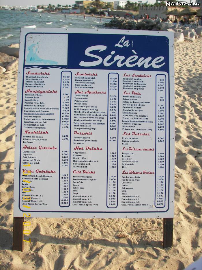 [P08] Preţurile practicate de restaurantul La Sirene aflat pe plaja din Port El Kantaoui, nu departe de hotelul Houria Palace. Preţurile sunt exprimate în dinari tunisieni.