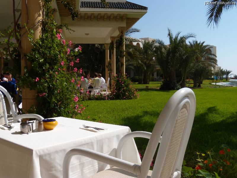 [P18] terasa barului de imediat langa restaurant; aici ne retrageam de mult, ori, dupa masa, la o cafea [vine vorba, cred ca in cele 7 zile am baut sute; mi-a placut la nebunie cafeaua in Tunisia, chiar mult mai mult decat cea din Turcia - si acest lucru va este spus de un cafegiu inrait] sau un pahar de tarie