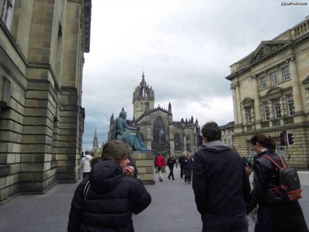 [P64] St. Giles Cathedral. Micuta se vede si o statuie a lui David Hume. In stanga e "Deacon Brodie Tavern".