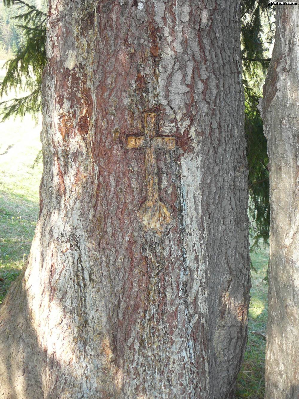 [P02] Una din crucile crestate pe trunchiurile copacilor, langa marcajele turistice