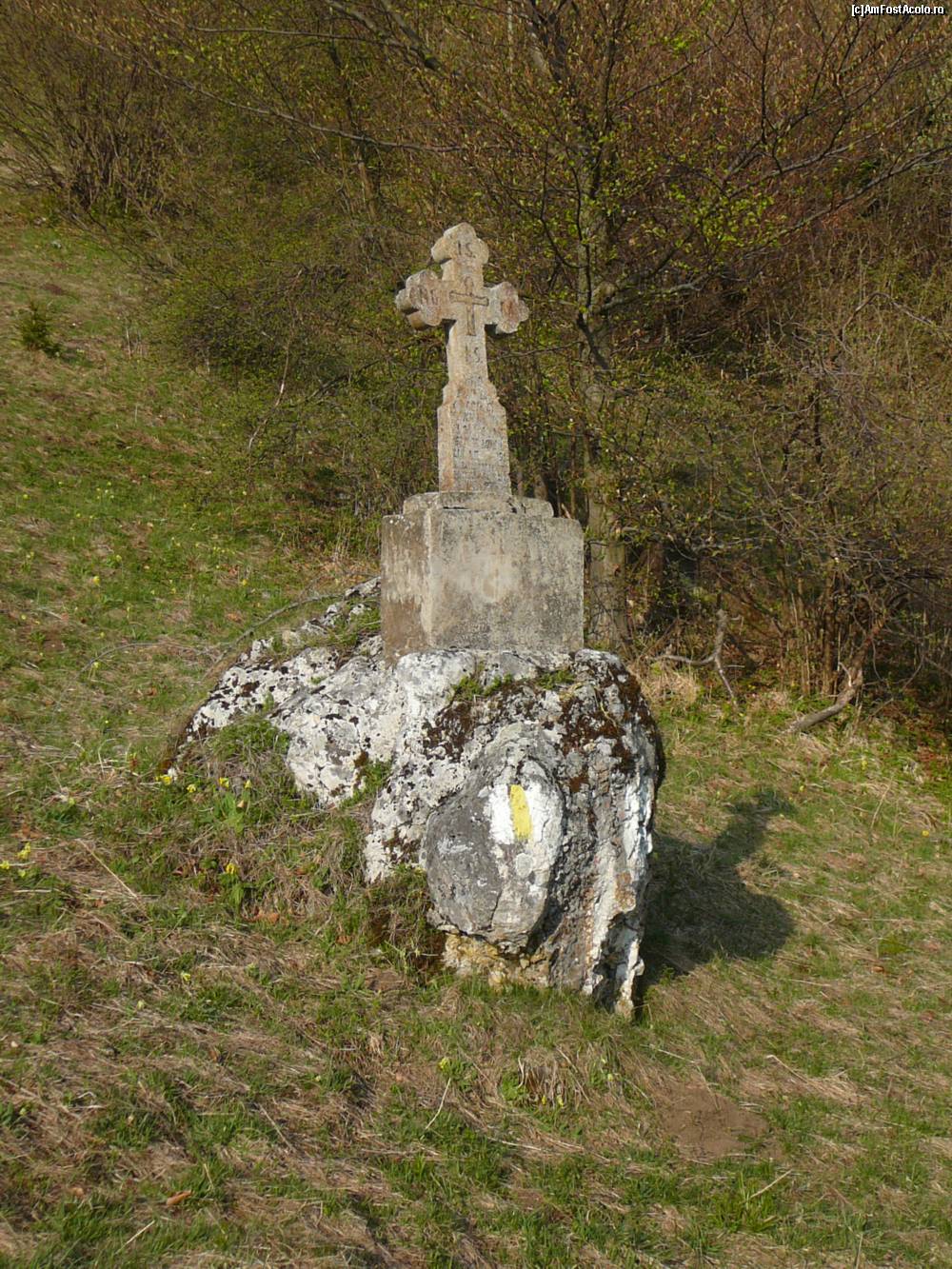 [P05] Una din crucile de piatra de pe traseu. Pe ea se poate vedea si marcajul turistic