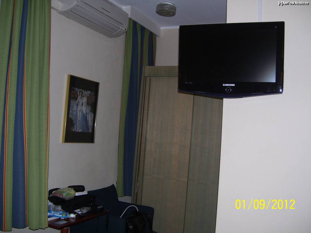 [P02] Partea din dreapta a camerei, cu dulapul, aerul conditionat, televizorul.