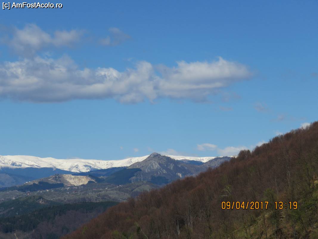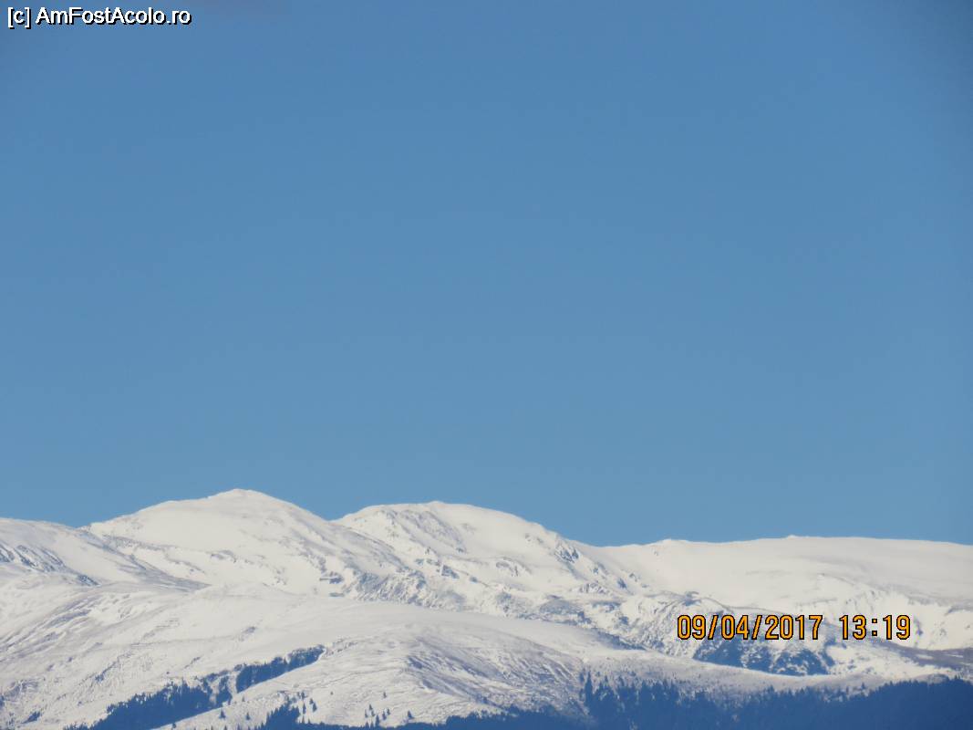 [P01] Zi însorită de aprilie, de pe platoul Cetățuii se văd zăpezile proaspete dinspre Cabana Voina.