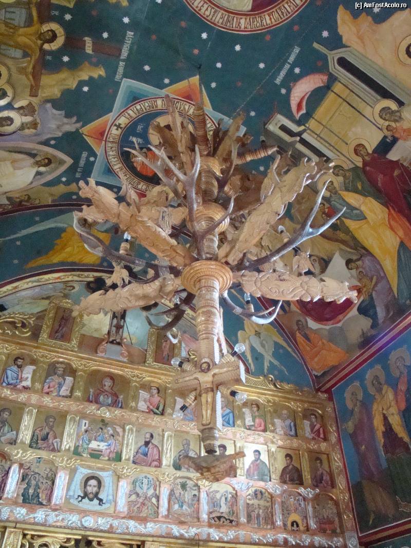[P34] Biserica nouă a Mănăstirii Cetățuia Negru Vodă : un frumos candelabru de lemn, inegrat armonios în arhitectura bisericii de lemn