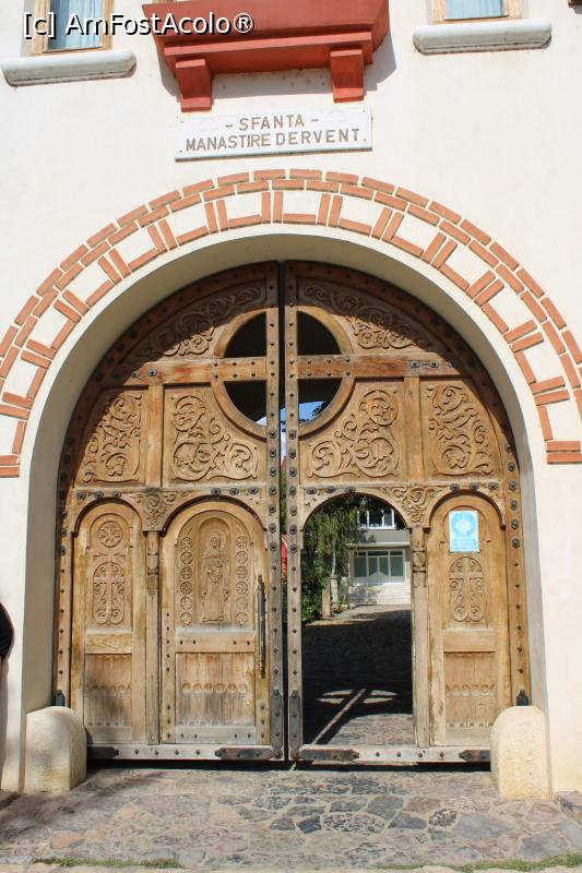 [P05] Ostrov, Sat Galița, Mănăstirea Dervent, Poarta din lemn cu sculpturi
