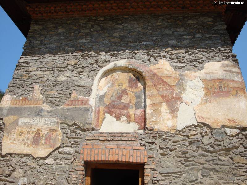 [P42] Mănăstirea Prislop: intrarea în biserica mănăstirii și zidul purtând urme ale picturilor exterioare din sec. XVI