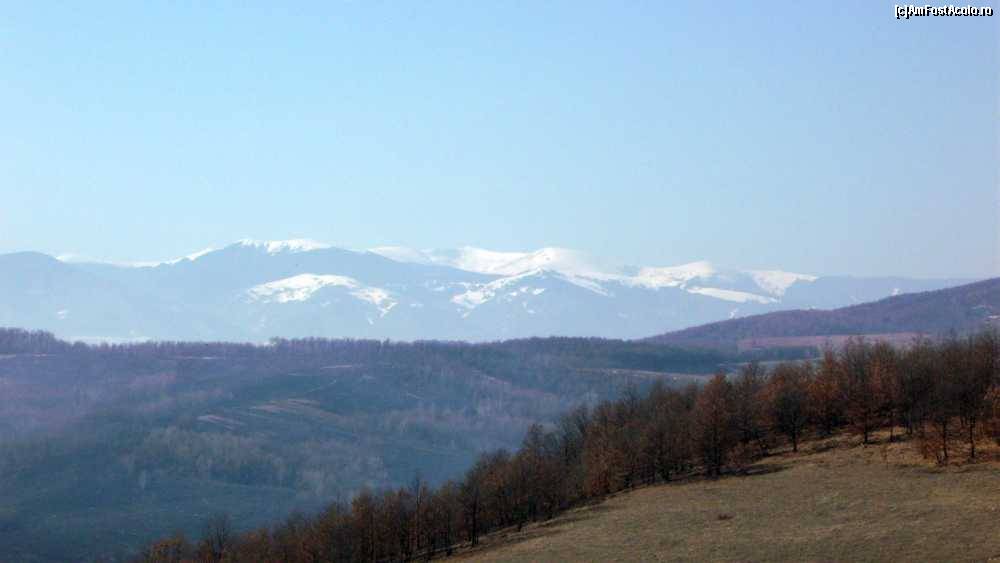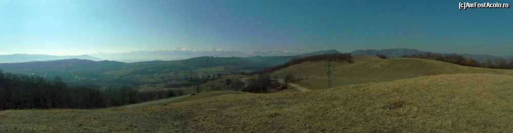 [P02] Mânăstirea Prislop - panoramă din apropierea DJ687A; în zare se văd crestele înzăpezite ale Retezatului. Mânăstirea e undeva spre dreapta, după dealuri.