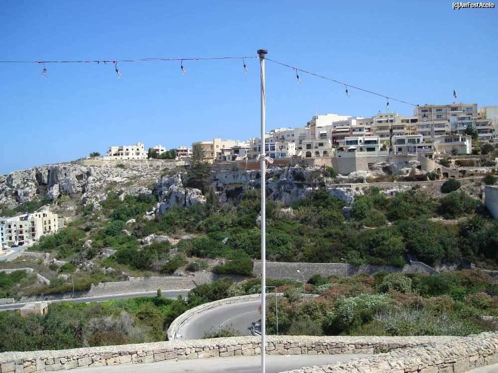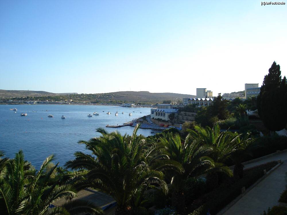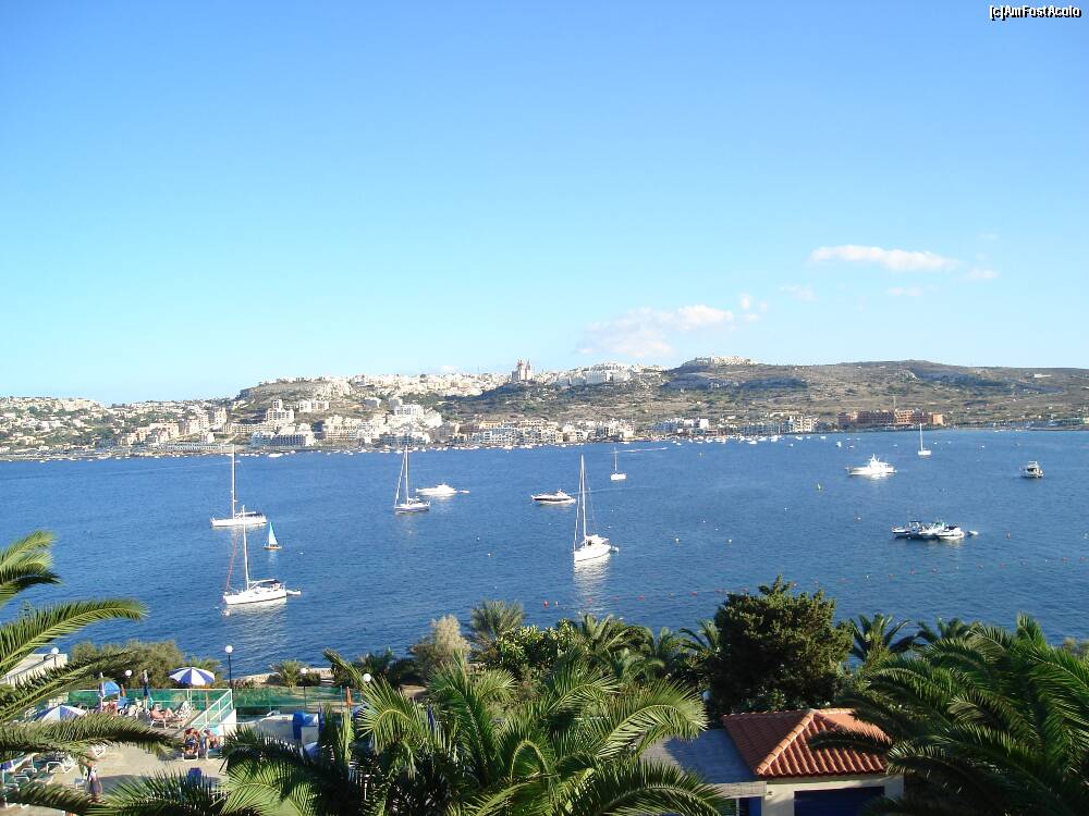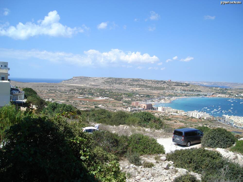 [P07] Golful Melieha. În depărtare, despărțită de o mică porțiune de mare, se vede o părticică din insula Gozo. Observați ce îngustă este insula Malta în această porțiune. Din dreapta până în stânga fotografiei, adică porțiunea de uscat, sunt aproximativ 1,5 km.