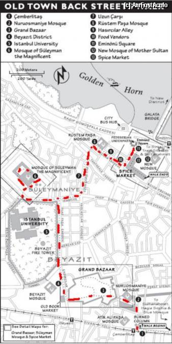 [P111] Traseu, pornind de la Çemberlitaş, se trece prin Kapalı Çarşı(3), se merge pe langa zidurile Universitatii Istanbul(5), se viziteaza Moscheea lui Suleyman (6) si Rüstem Paşa(8), si se ajunge in Eminonu. La nr10 e Magazinul Mehmet Efendi. Poza de pe net.