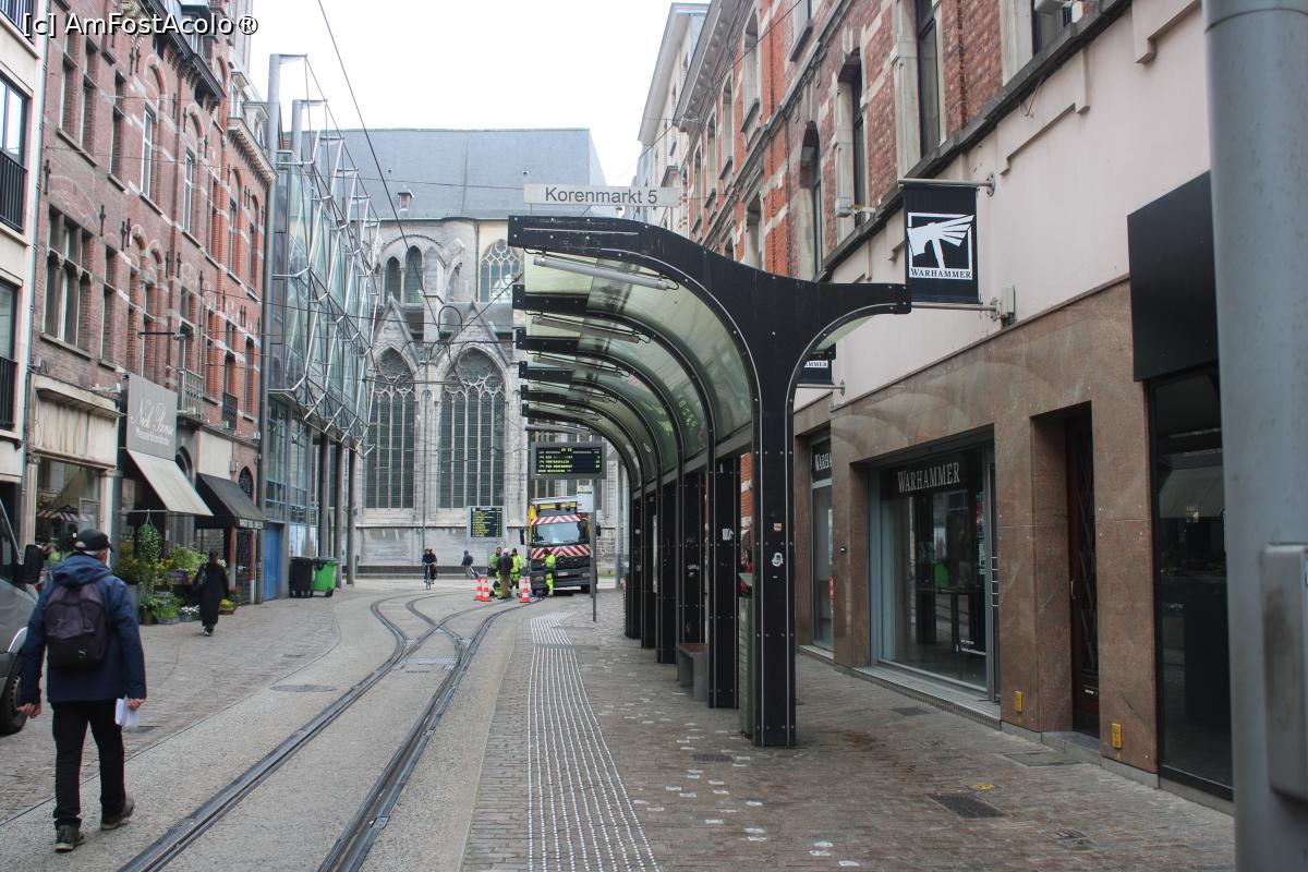 [P04] Gent, Stația Korenmarkt (Piața de Grâu) a Autobuzului P4, în plan secund se vede Biserica Sf. Nicolae