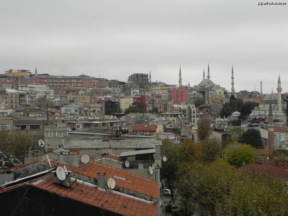 [P23] Vedere de pe terasa restaurantului către Sultanahmet. Peisaj urban tipic balcanic, oriental, sudamerican... + minarete.