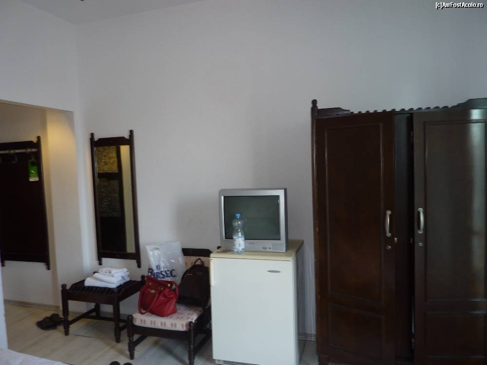 [P10] dotarile camerei: fotoliu, oglinda, masuta de bagaje, frigider (gol), televizor si sifonier.