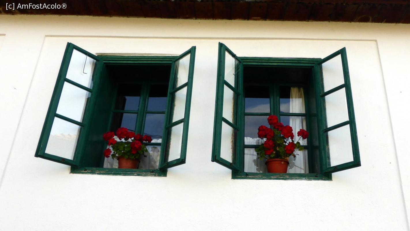 [P04] Ferestrele de la drum ale Casei Zabos. Peretele zugrăvit în alb, ferestre de lemn originale vopsite în verde și cu mușcate roșii la geam